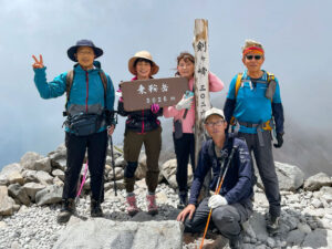 山頂からは来たアルプス・中央アルプス・南アルプス・御嶽山など360度のパノラマが広がる・・・はずなのですが、残念、霧の立ち込める登山日となってしまいました。